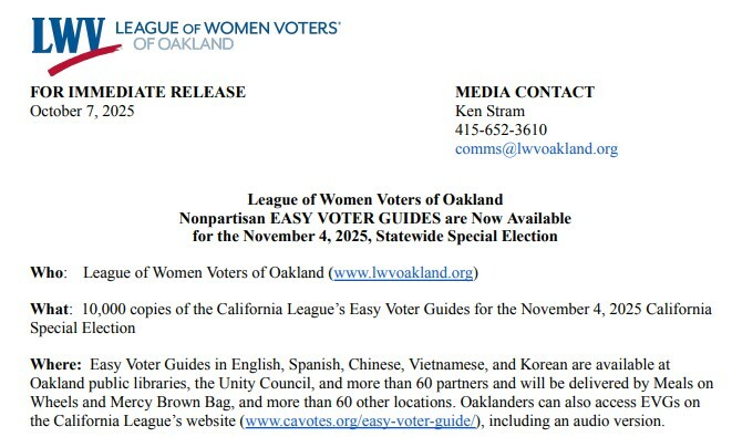 Email info@lwvoakland.org LWV Oakland (LWVO) P. O. Box 11055 Oakland, CA 94611