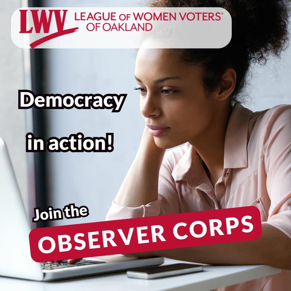 If you’re interested in learning more about how local government works, the Observer Corps is a great place to start. We need Observers for the Public Safety Committee, the Public Safety Planning and Oversight Commission, and the Alameda County Board of Supervisors. To learn more about Oakland’s Observer Corps, please contact Liz Hartka (lizhartka4@gmail.com).